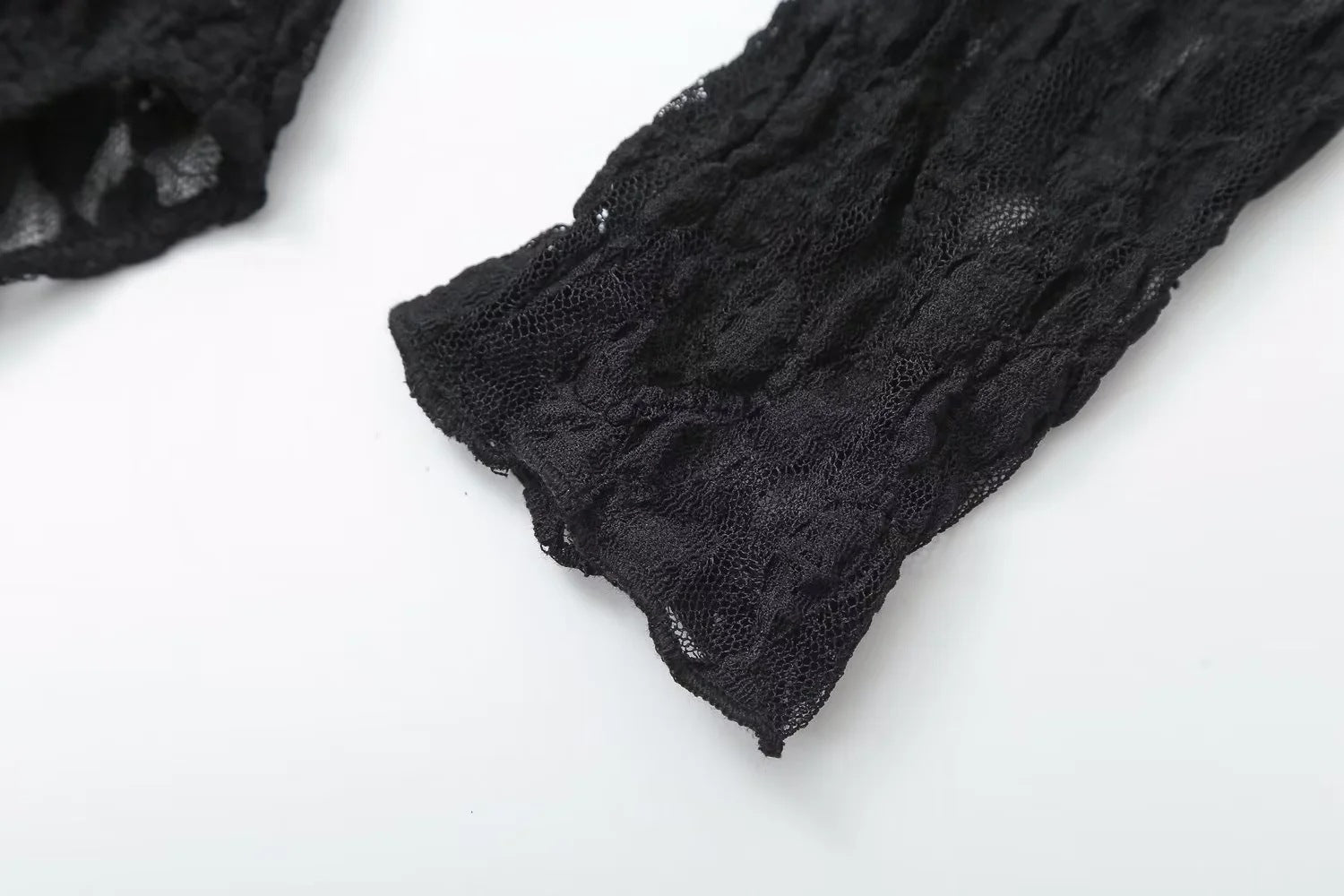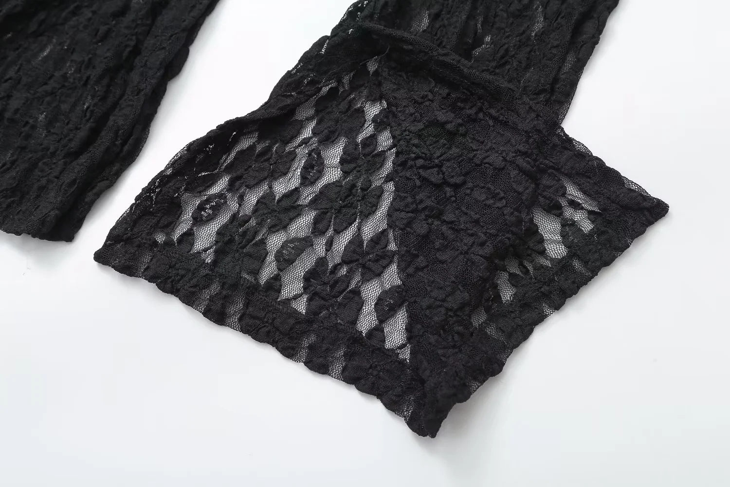 A daring black lace set featuring a sheer long-sleeve bodysuit and matching high-waisted trousers—bold, sultry, and made to command attention.